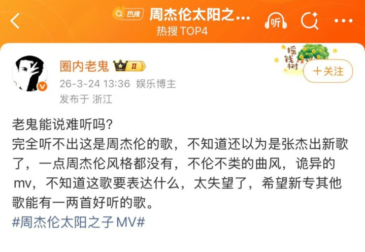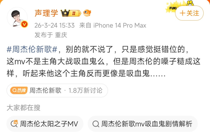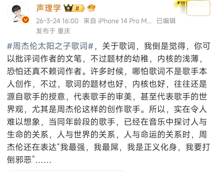 比如闻明音乐博主 @声理学 平直开炮,连发两篇长文把周杰伦的新歌骂得狗血喷头,按照这哥们的说法,周杰伦的嗓子糙,歌词内核浅近到幼稚。