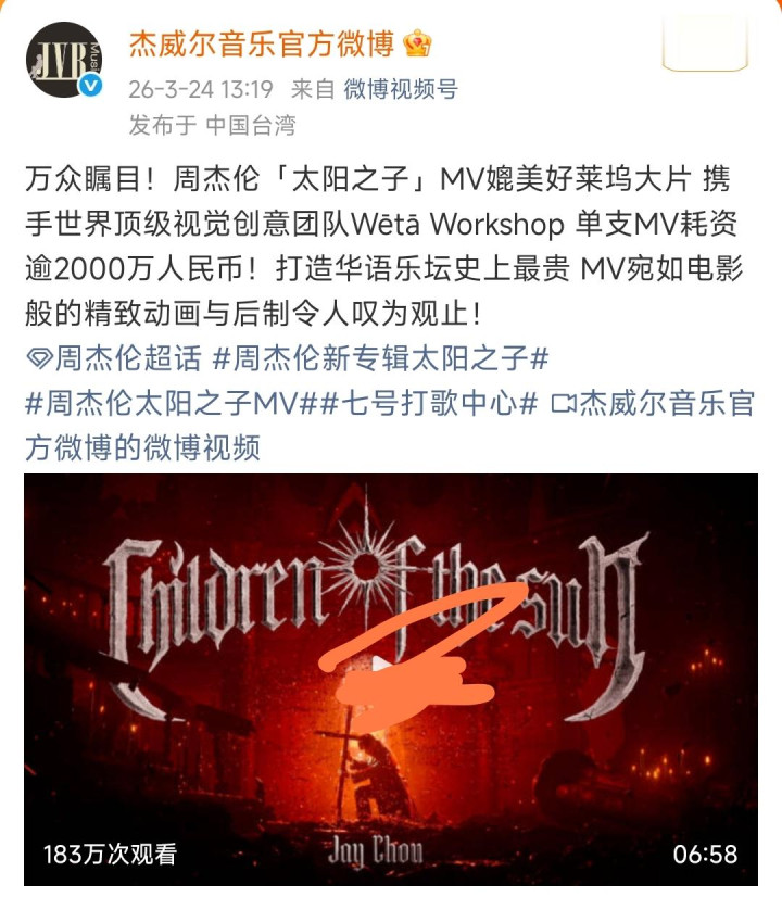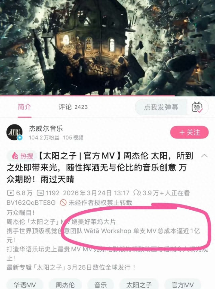 3月24日,周杰伦新歌《太阳之子》的官方 MV 刚上线,就带着 “单支老本靠拢 1 亿”“联手好莱坞顶级殊效团队 Weta Workshop” 的噱头,平直霸榜热搜。