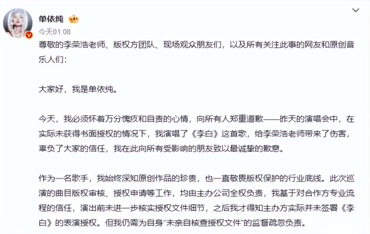 单依纯本东谈主更是表态,自得承担全额版权用度与补偿。