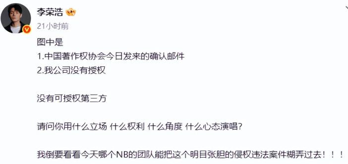 足见李荣浩濒临这次侵权,到底有何等不悦。
