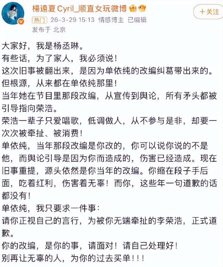 文中明晰默示让单依纯针对此前侵权行动谈歉。