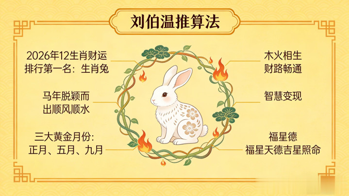 刘伯温在《烧饼歌》中屡次强调“木火相生”的情势。2026年,天干丙火、地支午火,双火皆旺。而生肖兔属卯木,木能生火——这叫“食伤生财”。