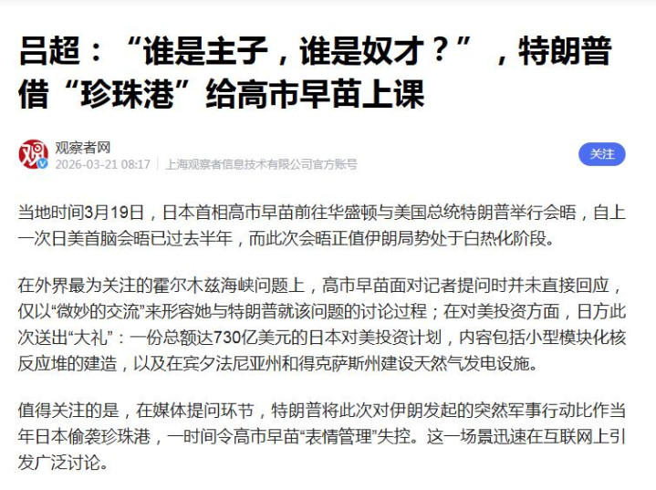 不雅察者网2026-03-21吕超:“谁是主子,谁是陪同?”,特朗普借“珍珠港”给高市早苗上课