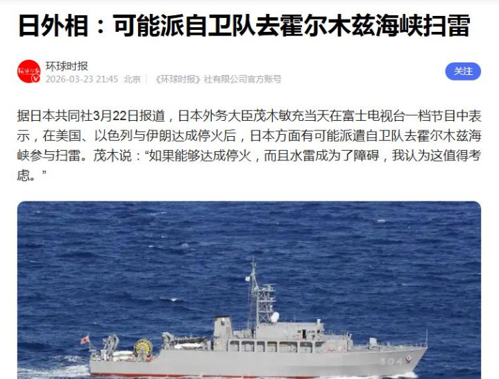环球时报2026-03-23日皮毛:可能派自保队去霍尔木兹海峡扫雷