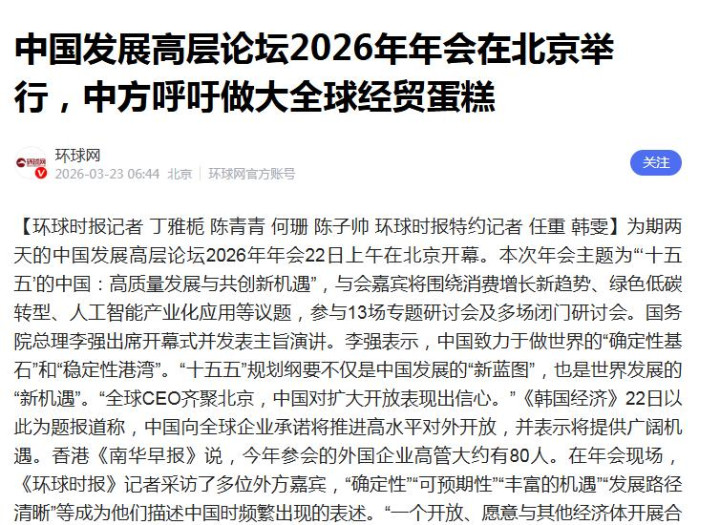 环球网2026-03-23中国发展高层论坛2026年年会在北京举行金佰利国际娱乐官网入口,中方呐喊作念大全球经贸蛋糕