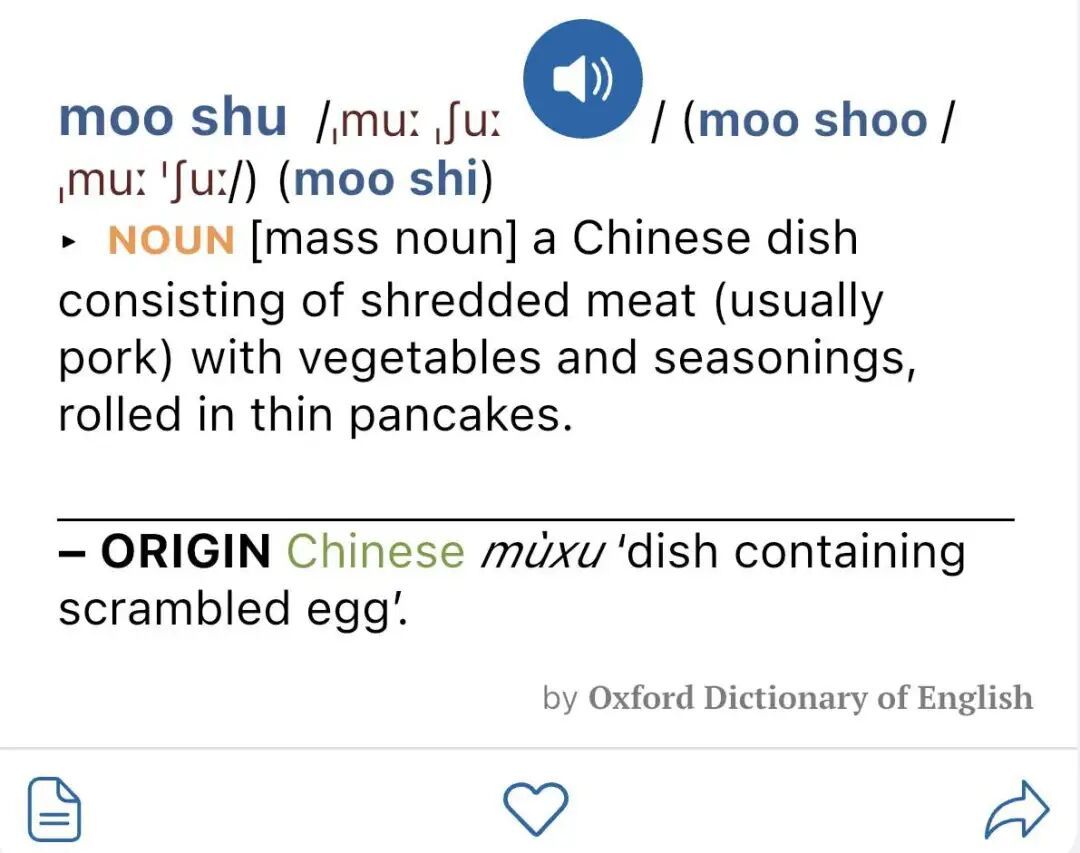 “木须”还有对应的英文抒发,而况确乎有鸡蛋之意。《牛津英语辞书》收录了词语“moo shu”,标注其词源为华文的“mù xu”,指含有炒鸡蛋的菜肴。