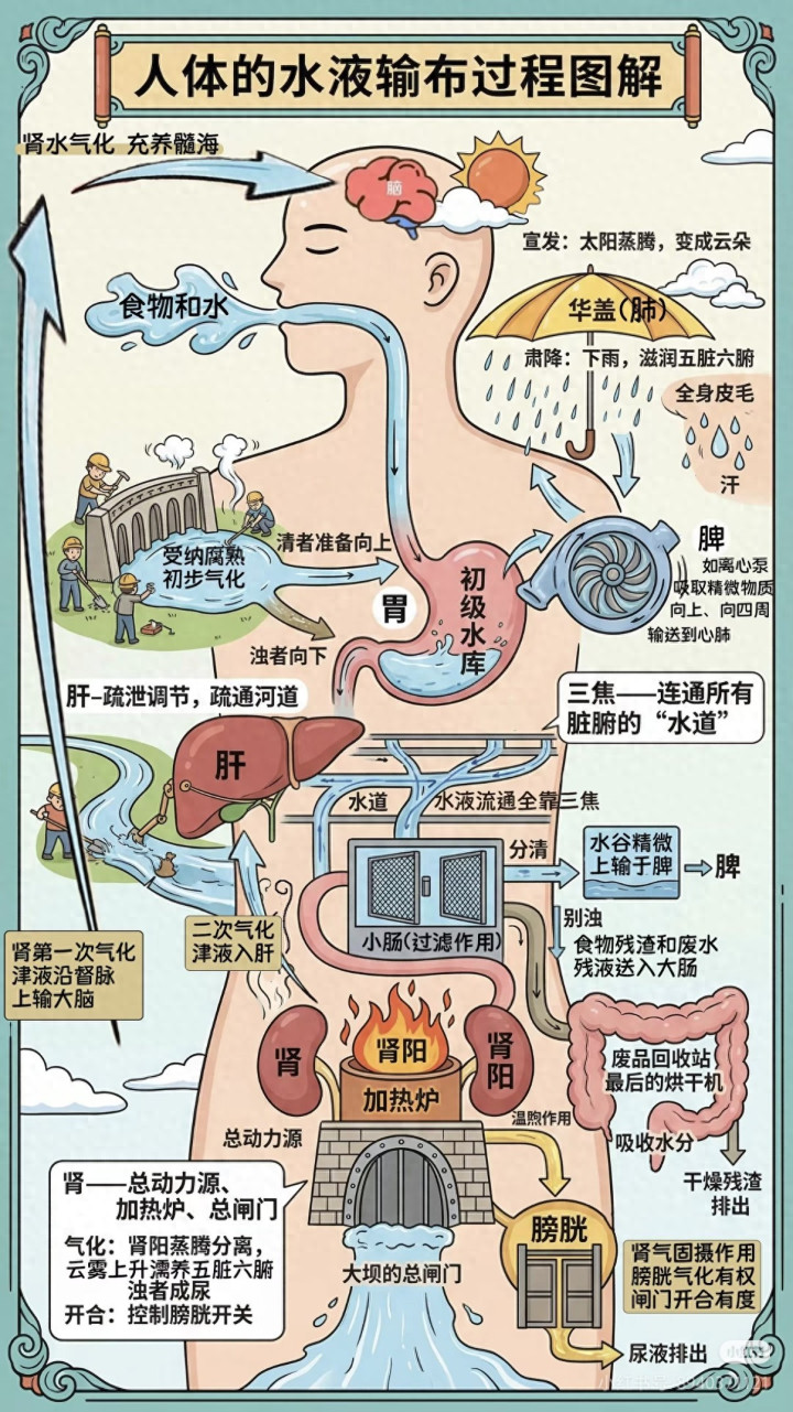 别再被“潮湿重”“水肿”“口干”搞懵了!这张图把东说念主体水液轮回讲得像“城市给水系统”,用大口语给你拆解,看完你就知说念为啥总觉多礼魄千里、嘴巴干了!
