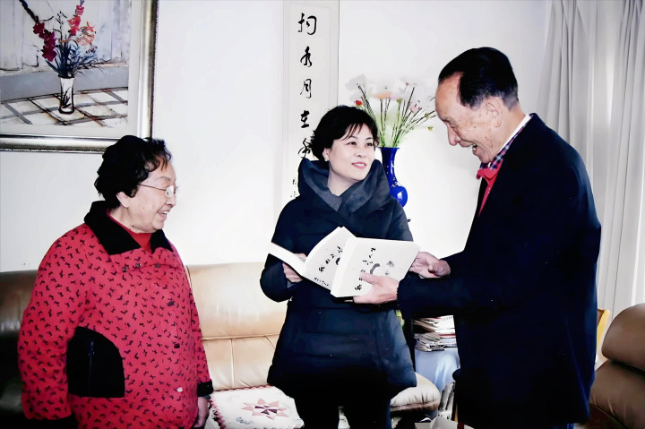 2017年,时任中国文联主席、中国作协主席铁凝(中)到家中看望慰问晓雪、赵履珠鸳侣