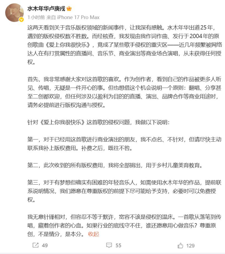 3月30日,歌手@水木年华卢庚戌 发布博文,喊话侵权其原创歌曲《爱上你我很甘愿》的东说念主: