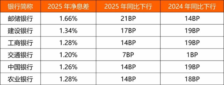 但对比2024年19个基点的降幅,息差下行幅度已有所改善,且在六大行中,建行息差弘扬处于前线。