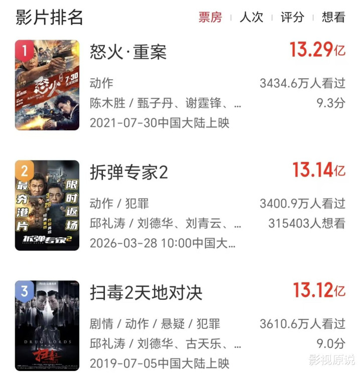 不外比较可惜的是,《拆弹众人2》在香港电影票房冠军的这个位置上并没能坐太久,不到一年的时代,它就被甄子丹和谢霆锋调和主演的《肝火重案》出奇了。