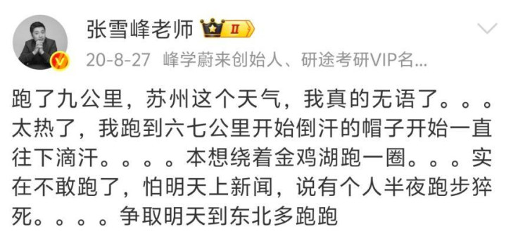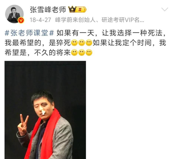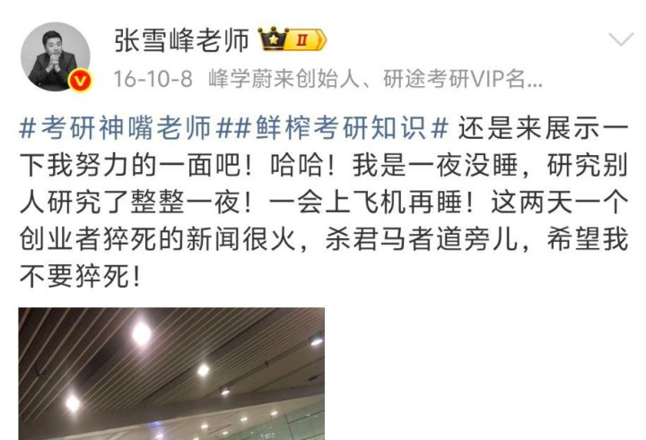 2016年,张雪峰微博第一次出现了“暴毙”两个字,他整夜没睡,坐在机场担忧着、感触着,但愿我方不要暴毙。