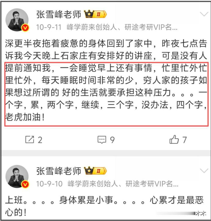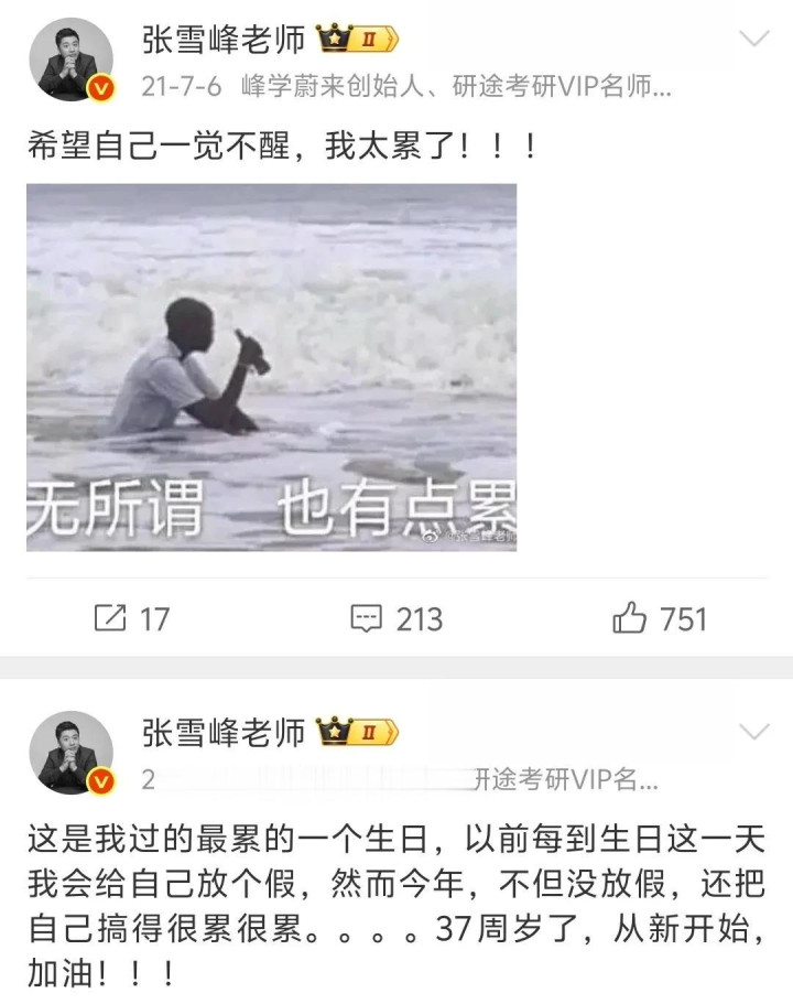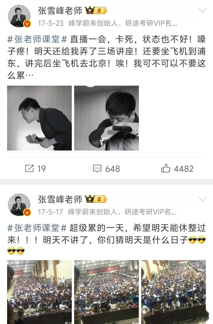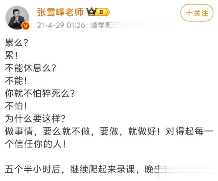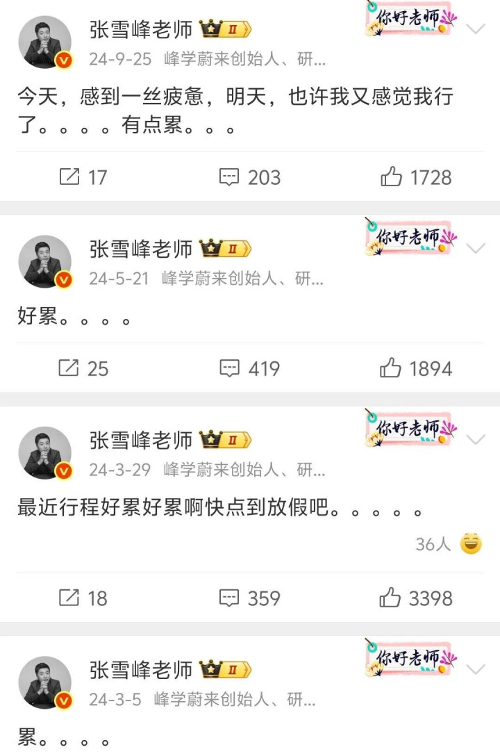 十几年技能,张雪峰发了几十条喊累的微博,早年非日非月到处跑线下讲座,累到不念念生计,累到念念哭,走红之后,职责量更大了,连过诞辰皆以为累。
