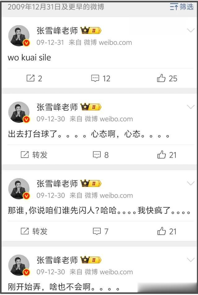 张雪峰从2009年起,也即是17年前,就运转使用微博了,使用微博第二天,张雪峰就发了一条“wo kuai sile”。