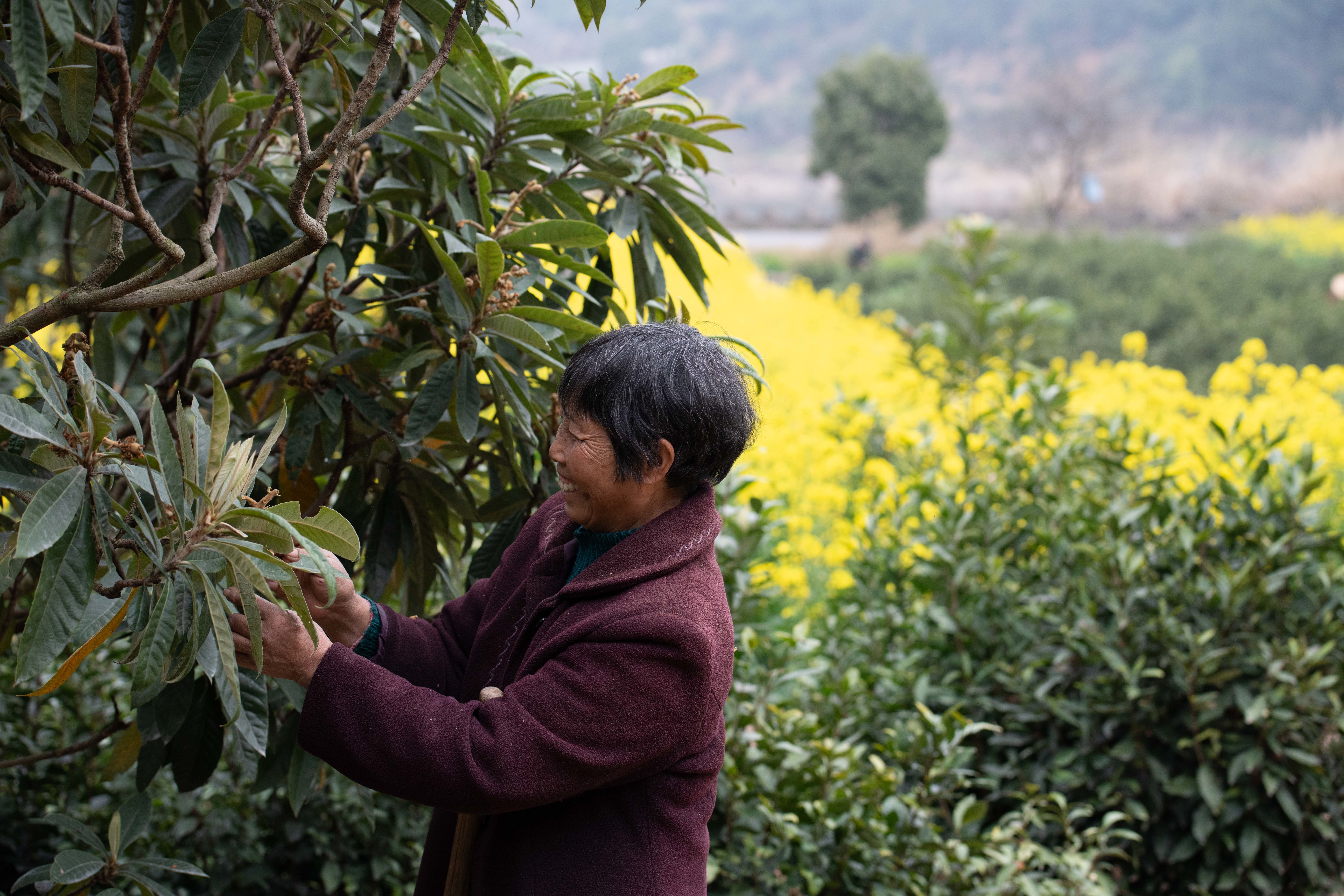 3月15日,在安徽省黄山市歙县坑口乡新安江畔,村民对枇杷树进行春季管护。