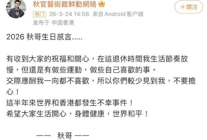 近日,适值郑少秋农历诞辰,他在酬酢媒体上发布了一段轻便却事理深长的“诞辰感言”,这是他近三年来荒原的一次公成立声。