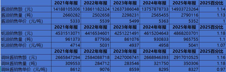 赓续从海天味业的酱油,蚝油和调味酱三大单品的量价情况来看。酱油家具事迹增长的主要启上路分是量的增长。2025年海天酱油商业收入为149.34亿元,是2021年酱油商业收入的1.14倍,而2025年海天酱油的销售量为279.01万吨,是2021年海天酱油销售量的1.13倍,同期2025年海天酱油的每吨销售单价为5352亿元,是2021年海天酱油每吨销售单价的1倍,且2025年海天酱油每吨销售单价同比下落0.21%。也等于说海天酱油商业收入的增长主如若销售量的增长所启动。