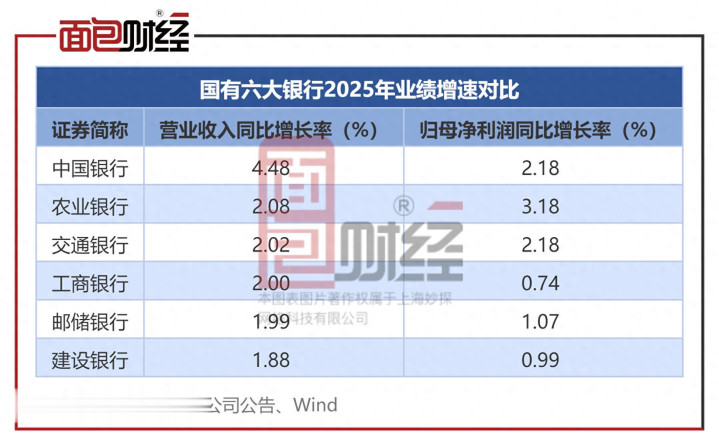 数据清晰,2025年国有六大行归母净利润均罢了正增长,但增速分化彰着:农业银行以3.18% 的增速领跑;中国银行和交通银行增速均为2.18%;邮储银行增速为1.07%。