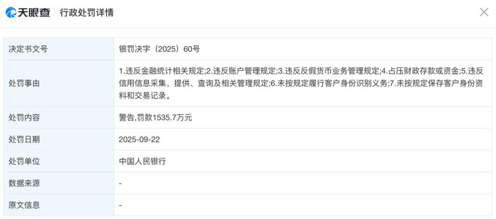 天眼查APP骄慢,2025年9月22日,中信银行因7项违章行动,被央行告戒,并罚金1535.7万元。